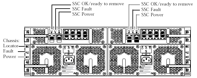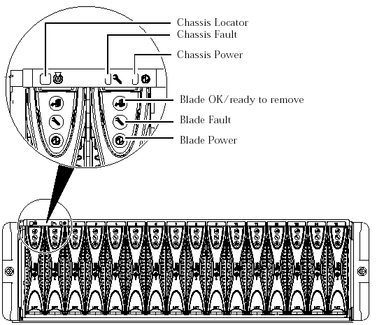 Use the LEDs on the individual system components to determine if the system is operating normally. We recommend you monitor the LEDs routinely on the SSCs, Power Supply Units, and server blades. The LEDs can be off, on, or in some cases blinking slowly or flashing. When the fault LED is on (lit), this indicates that a fault has occurred in the component. A fault is any condition that is considered to be unacceptable for normal operation. When the fault LED is lit, you must take immediate action to clear the fault. You can only remove a hot-swappable component when the blue OK/ready to Remove LED is lit. Front Panel LEDs | |||||||||||||||||||||||||||||||||||||||||||||||||||||||||