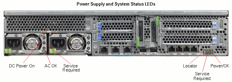 The left rear of the Sun Fire V245 server contains the two power supplies with three LED status indicators.