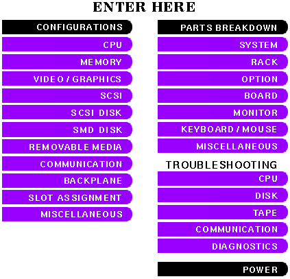 ![]() [ Configurations ] [ CPU ] [ Memory ] [ Video/Graphics ] [ SCSI ] [ SCSI Disk ] [ SMD Disk ] [ Removable Media ] [ Communication ] [ Backplane ] [ Slot Assignment ] [ Miscellaneous ] [ Parts Introduction ] [ System ] [ Rack ] [ Options ] [ Board ] [ Monitor ] [ Keyboard/Mouse ] [ Miscellaneous ] [ CPU Trouble ] [ Disk Trouble ] [ Tape Trouble ] [ Communication Trouble ] [ Diagnostics ] [ Power ]