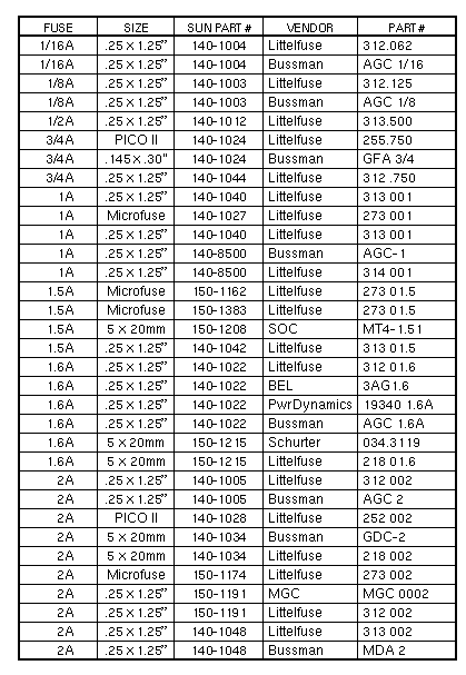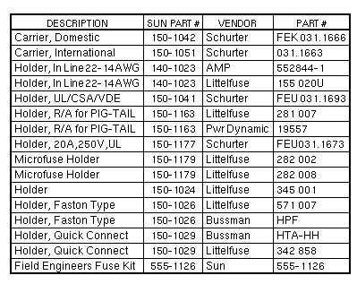 Subminiature microfuses are used on many Sun Printed Circuit Boards. Subminiature microfuses are field replaceable. PICO II fuses are used on Printed Circuit Boards and Peripheral devices such as Tape and Disk Drives. PICO II fuses are not field replaceable because they are soldered in place. Positive Temperature Coefficient (PTC) thermistors are resistors with a high positive temperature coefficient of resistance. The PTC is used as a self-resetting fuse in overload applications. When an overload current flows through a PTC, there is a specific time period before the PTC heats up to its high-resistance state and starts limiting the current. PTCs are not field replaceable because | ||||||||||||