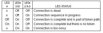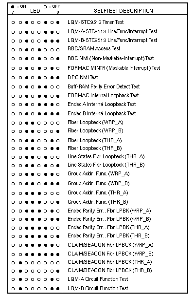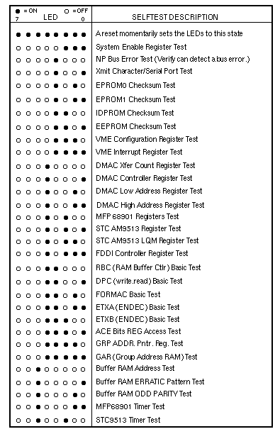 Volume II: Troubleshooting - CommunicationFDDI/DXSelftestNormal mode selftests run at powerup when the DIAG/NORM switch is in the NORM position. Attach a terminal set for 9600 baud, 8 data bits, no parity, and 1 stop bit to the serial port to monitor normal mode selftest output. Extended SelftestsExtended selftests are run with the DIAG/NORM switch in the DIAG position. Attach a terminal set for 9600 baud, 8 data bits, no parity, and 1 stop bit to the serial port, and attach loopback cables between ports FDDI-A and FDDI-B. Enter s to enable the extended selftests. Enter a to display the Diagnostic Engineering Monitor (DEMON) menu. LEDsLEDs indicate the status of the FDDI PCB and the network during operation. LEDs 4, 1, and 0 indicate connection status for port FDDI-A. LEDs 4, 3, and 2 indicate connection status for port FDDI-B. LED 4, RINGOP, is ON when the ring is not operational. LED 5, PACKETIO, changes state each time a packet is received or successfully transmitted. LEDs 6 and 7 blink alternately four times per second under normal conditions. LEDs 6 and 7 blink together two times per second when a non-recoverable firmware problem occurs. LED Patterns During Selftests | ||||||||||||