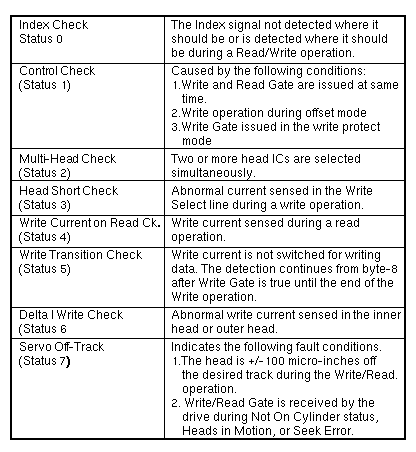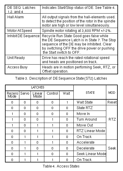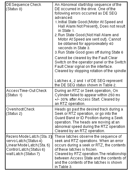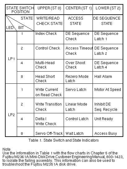 Volume II: Troubleshooting - DiskFujitsu M2361Drive Status and StateTable 1 describes the drive state information indicated by two 7-segment LEDs, depending on the position of the toggle State Switch. The Write/Read Check State, Access State, and DE Sequence State are described on the following pages. Write/Read Check State (ST 0) The Write/Read Check State indicates fault status during a Write or Read operation. When a fault status occurs in the drive, the Fault signal in the Unit Status is issued as a summary to the controller. The controller issues a Fault Clear Signal to clear the Write/Read Check State. Access State (ST 1) The Access State indicates the access status of the head in Seek and RTZ operation and the Start/Stop sequence of the spindle motor. DE Sequence Latches | ||||||||||||
