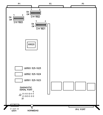 - Dip Switches 3, 4, and 5 of SW1603, select bits A10, A11, and A12 of the