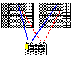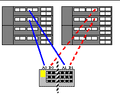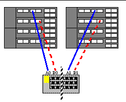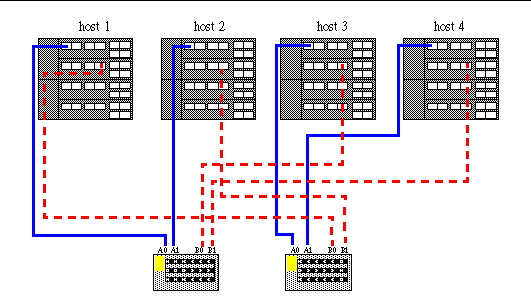This is the optimal single host split loop config because it delivers both the highest fault tolerance and performance by utilizing all 4 loops on 4 separate HBAs and sbuses. 7). Dual Host, single loop