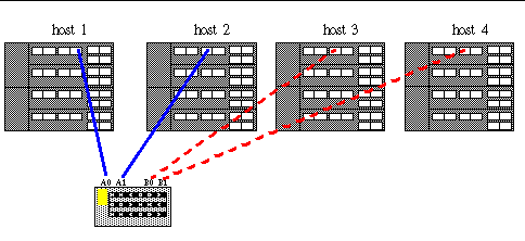 Each host sees only half the disks or one backplane. This config is for box sharing where each host has private and exclusive access to half the array disks. This is useful to guarantee that the hosts do not interfer with each others disks. This is a fully redundant config. 11). Three and Four Host, single path